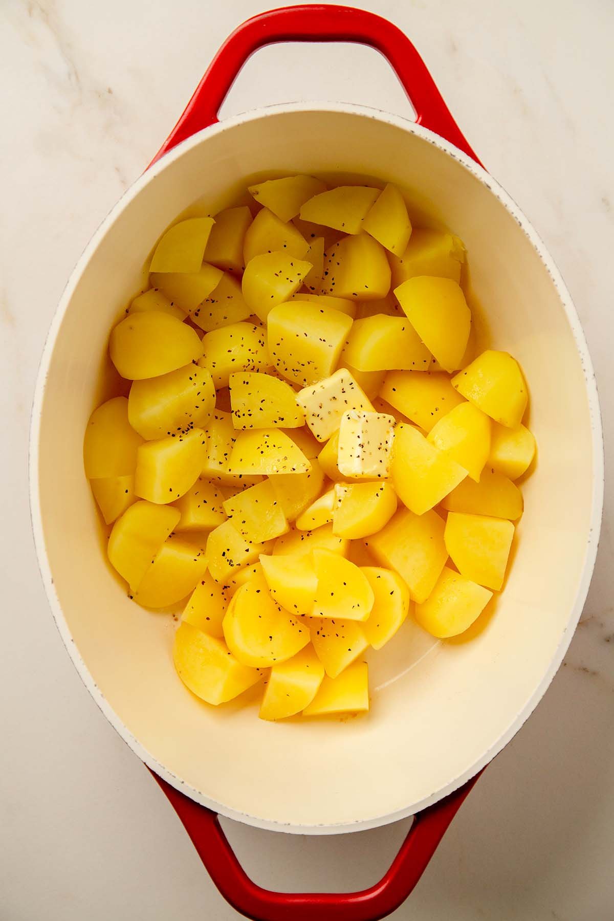 Drain and season: Once tender, drain well, return them to the warm pot to steam off any extra moisture (this keeps your mash fluffy instead of watery).