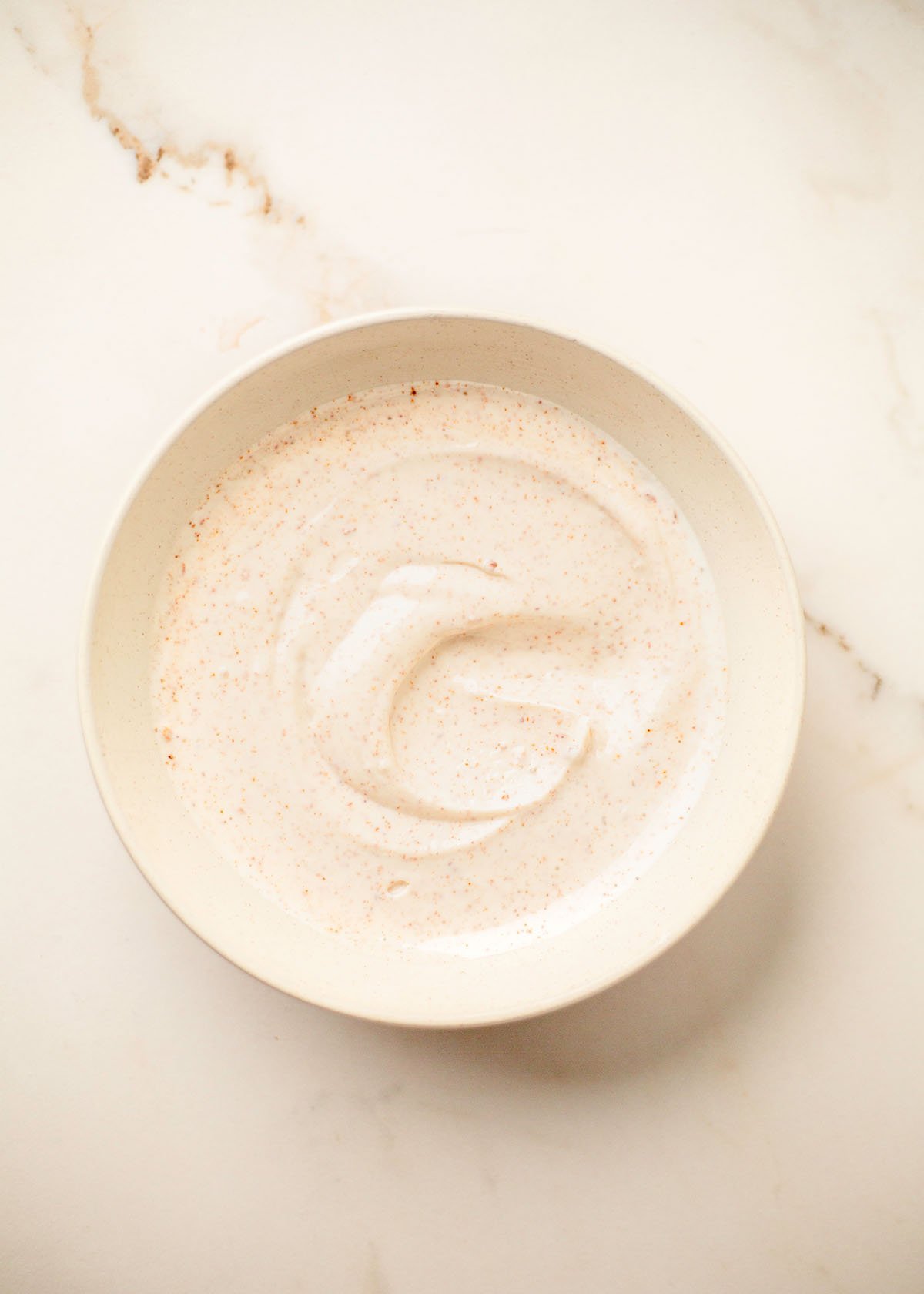 - Mix the taco-seasoned Greek yogurt and refrigerate in a covered container.