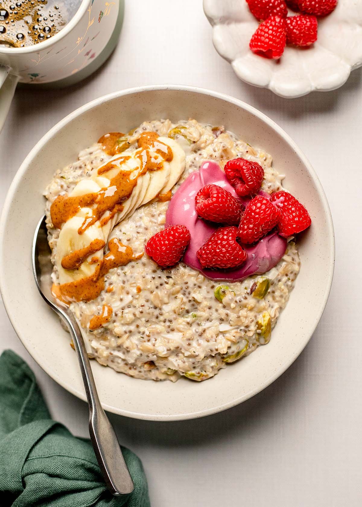 This protein oatmeal bowl feels downright luxurious! It's the warm, cozy version of my overnight oats. You're getting nutritious whole grains, protein from pistachios and hemp seeds, fiber from chia seeds, and healthy fats from coconut. A dash of pure maple syrup keeps the sweetness subtle but still indulgent.