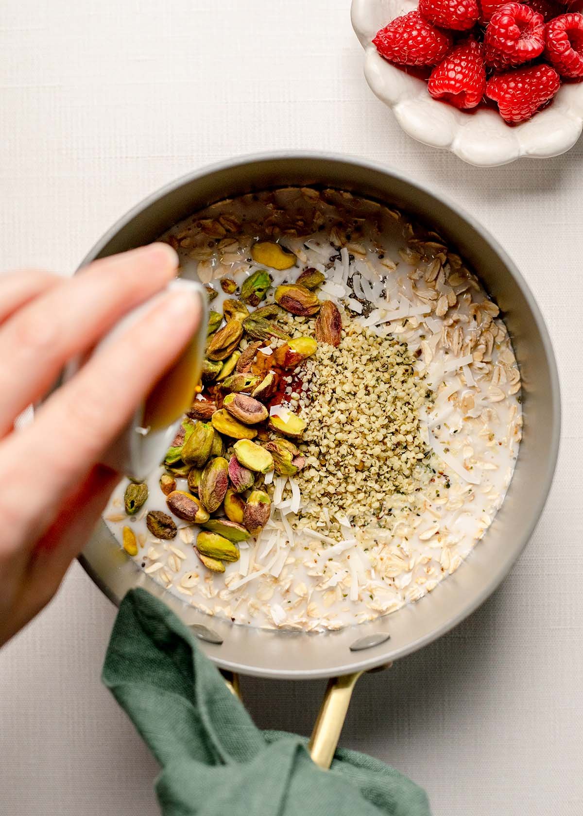 - Stir in the raw pistachios, unsweetened coconut flakes, hemp seeds, chia seeds, a pinch of sea salt, and pure maple syrup.