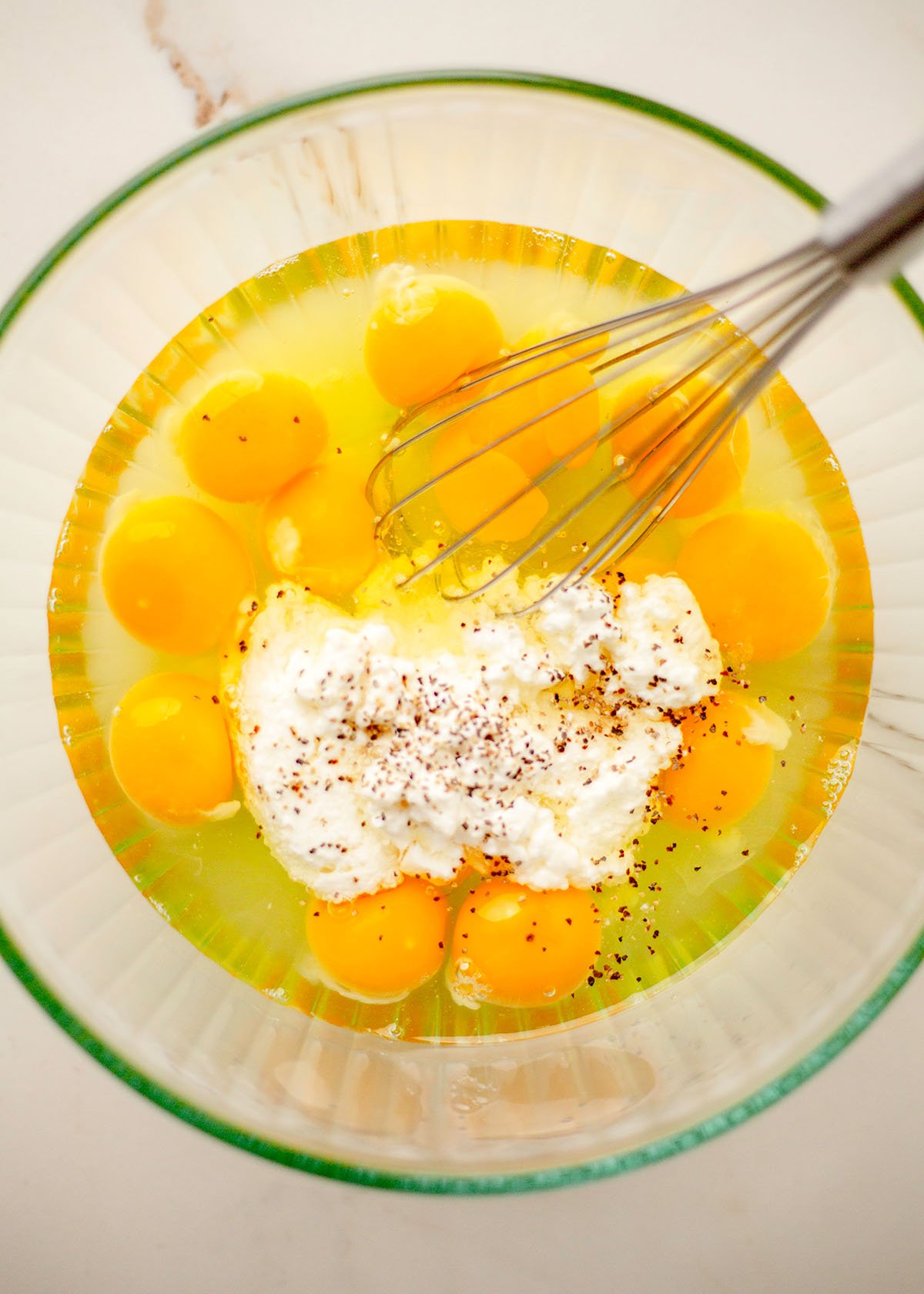 - In a large bowl, whisk together the eggs, cottage cheese, salt, and pepper until smooth.