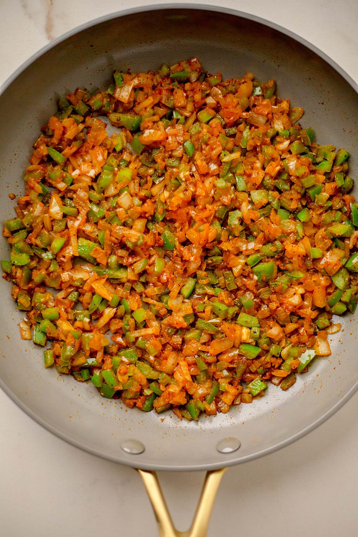 - Heat a skillet over medium heat with a drizzle of olive oil. Add the diced bell peppers, onion, and spices. Cook until the vegetables soften, about 3-5 minutes.